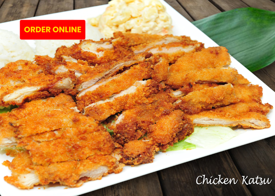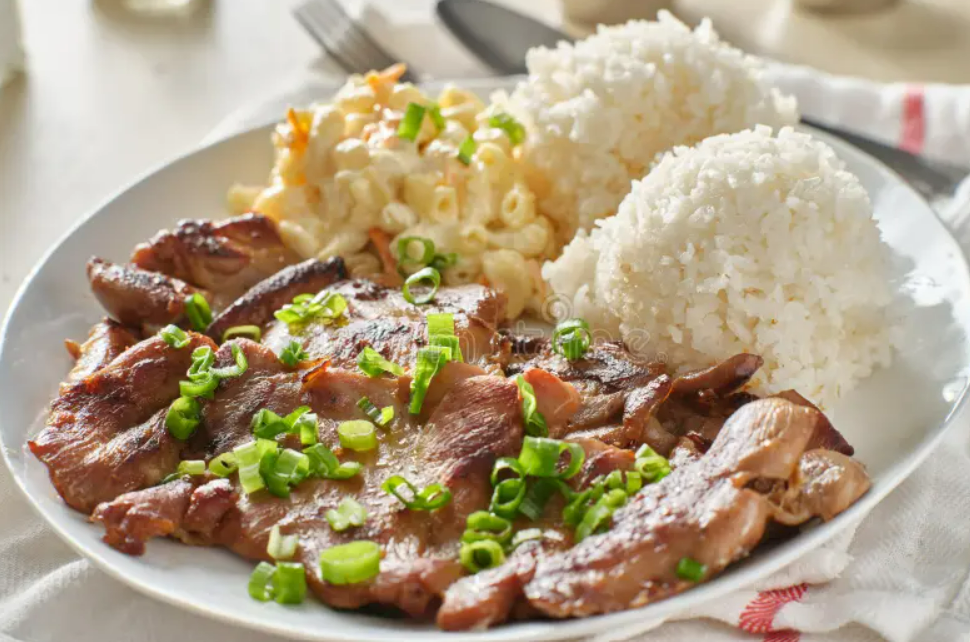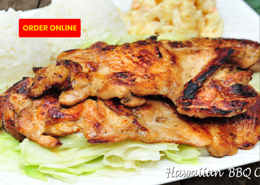 Grilled boneless chicken glazed with teriyaki sauce and served with rice and macaroni salad. A true island classic with a sweet tropical touch.